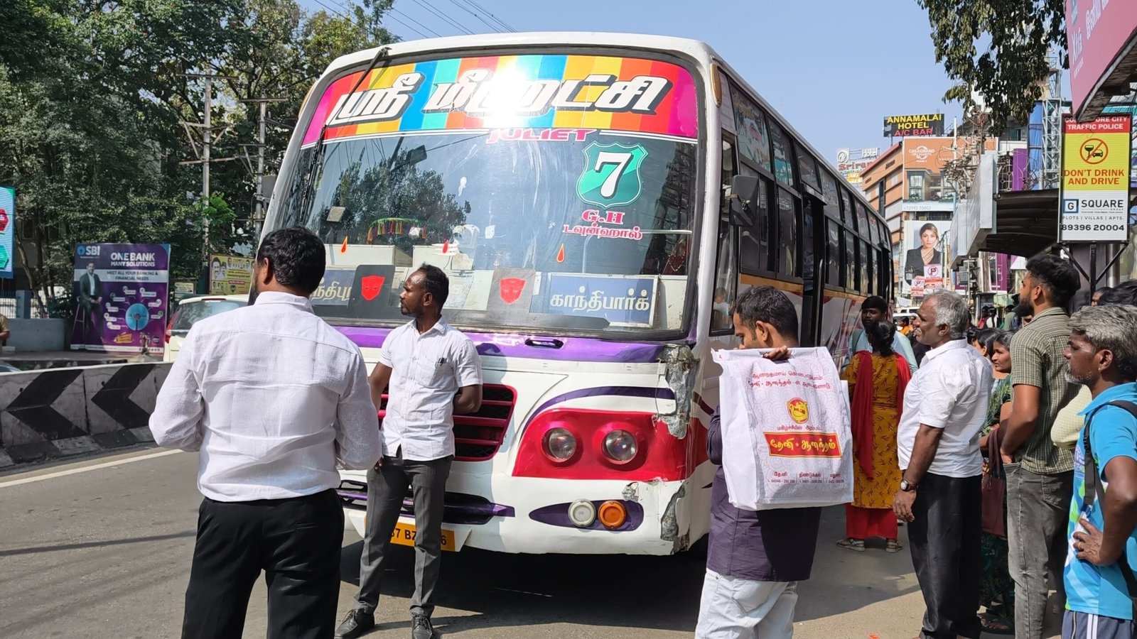 சினிமா தியேட்டர்களில் அதிக விலைக்கு டிக்கெட் விற்பனை செய்கிறார்கள் . எப்படி படம் பார்ப்பது இதை யாரும் தட்டி கேட்பதில்லை என கோபத்தில் அவர் பஸ் செல்ல விடாமல் தடுத்து வாக்குவாதம் செய்தார். வழக்கம்போல் போலீசார் அங்கே சென்று மிரட்டி எச்சரித்து அனுப்பி வைத்தனர்.