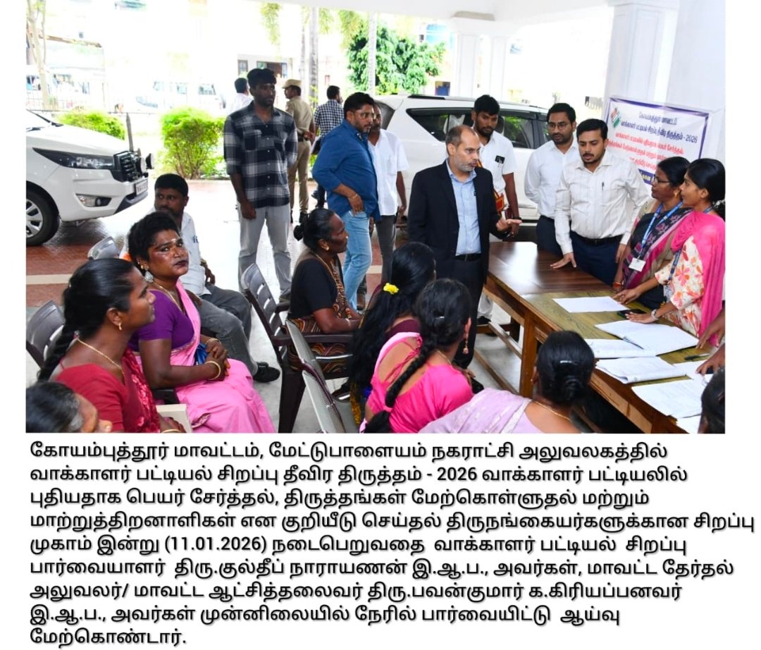 முகவரி மாறியவர்கள் நீக்கப்பட்டவர்கள் தொடர்பான புகார்கள் மீது என்ன நடவடிக்கை எடுக்கப்பட்டது என விசாரித்தார். வாக்காளர் பட்டியலில் உள்ள பிழைகளை சரி செய்து விரைவில் இறுதி வாக்காளர் பட்டியல் வெளியிடும் வகையில் பணிகளை மேற்கொள்ள உத்தரவிட்டார். இதில் கோவை கலெக்டர் பவன் குமார் உட்பட பலர் கலந்து கொண்டனர்.