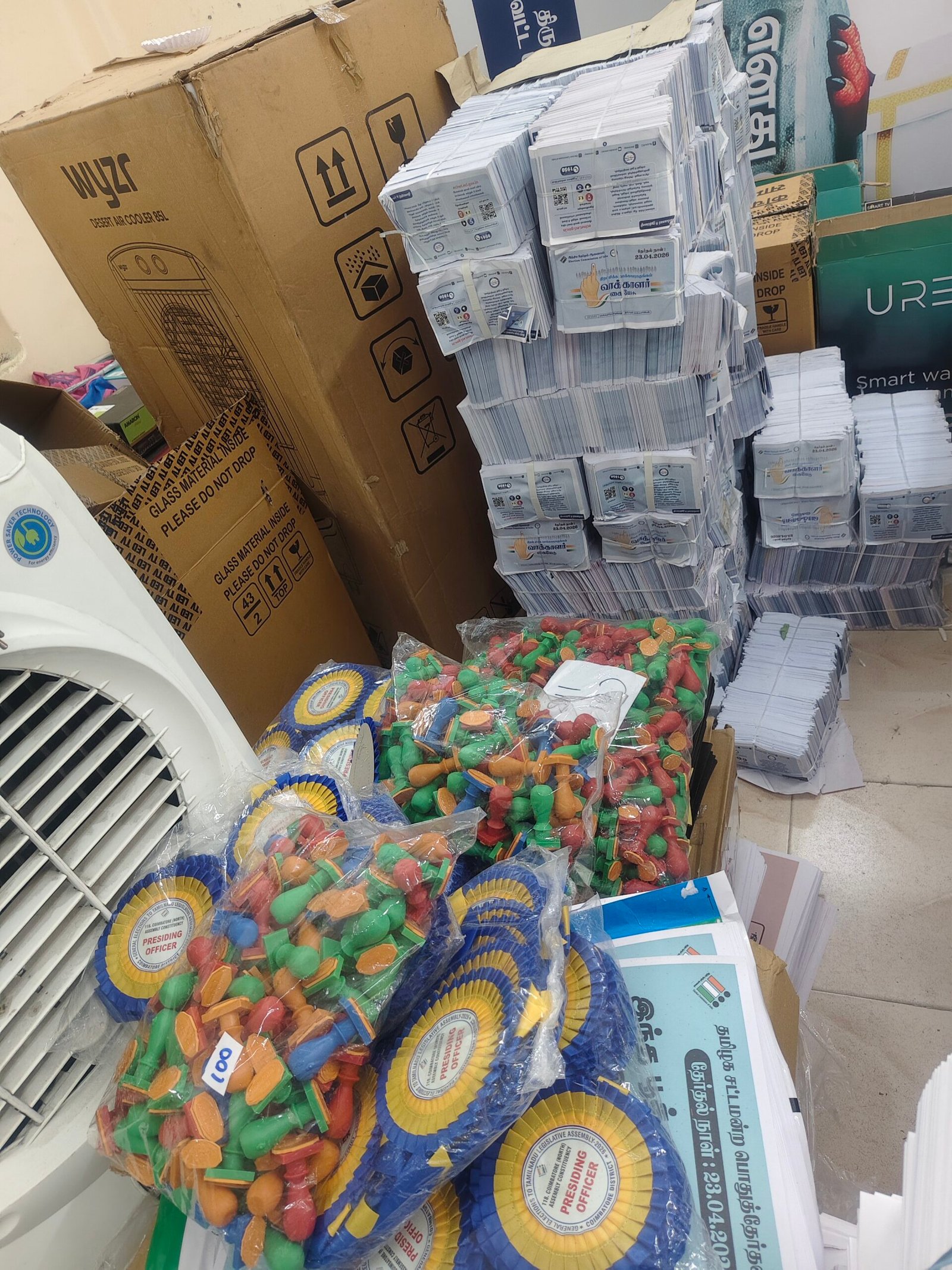 ஏற்கனவே கோவை மாவட்டத்தில் 10 லட்சத்திற்கும் மேற்பட்ட தேர்தல் பொருட்கள் பிரதிகள் வாங்கப்பட்டது. நாளை தேர்தல் கமிஷனின் சிறப்பு சப்ளையான அழியாத மை குப்பிகள் வந்து விடும். மேலும் ஓட்டு சாவடிகளுக்கான ரகசிய பேப்பர் வர வேண்டியுள்ளது. இந்த ரகசிய பேப்பர் ஓட்டு பதிவு மெசின், கட்டுப்பாட்டு கருவி, சின்னம் காட்டு கருவியில் ஒட்ட வேண்டும்.