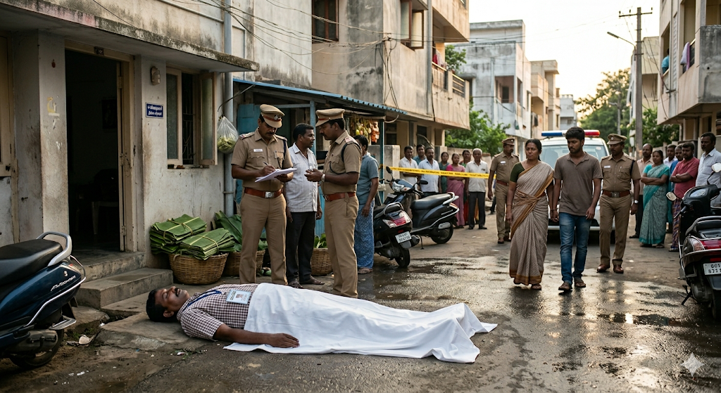 வாழை இலை வியாபாரி .இவர் மனைவி பூங்கொடி (43) இவர்களது மகன் அருண்குமார் (21) மற்றும் விஷ்ணு பிரசாத் (18.. விஜயகுமாருக்கு மது போதை பழக்கம் உள்ளது . தினமும் அவர் மது குடித்துவிட்டு வந்து குடும்பத்தினருடன் வாக்குவாதம் செய்து கொண்டுள்ளதாக தெரிகிறது.