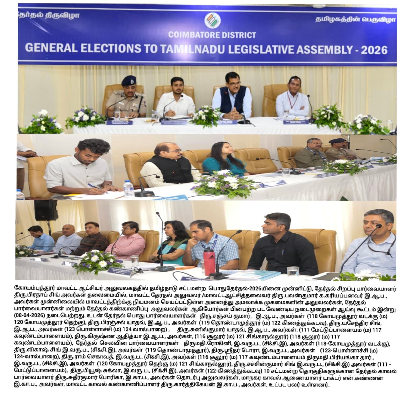 கோவை மாவட்ட கலெக்டர் அலுவலகத்தில் சட்டமன்ற பொது தேர்தல் சிறப்பு பார்வையாளர் பிரதாப் சிங் தலைமையில் அனைத்து அமலாக்க முகமைகளின் அலுவலர்கள், தேர்தல் பார்வையாளர்கள் மற்றும் தேர்தல் கண்காணிப்பு அலுவலர்களுக்கான நடைமுறைகள் குறித்த ஆய்வு கூட்டம் இன்று நடந்தது.