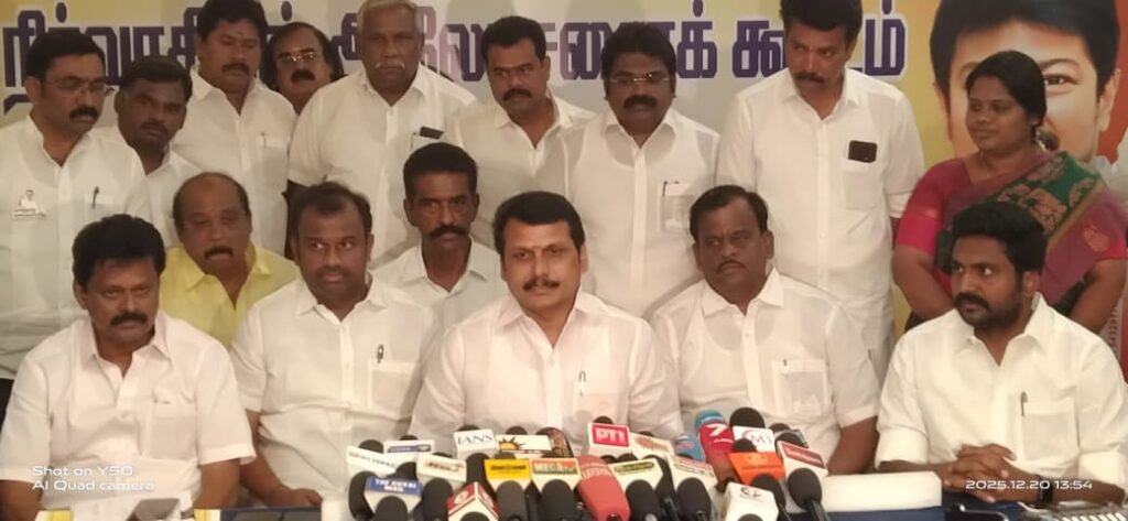 கூட்டத்திற்குபின்னர் முன்னாள் அமைச்சர் செந்தில் பாலாஜி செய்தியாளர்களை சந்தித்தார். திமுகவின் கள்ள ஓட்டுகள் தான் நீக்கப்பட்டு இருக்கிறது என நைனார் நாகேந்திரன் தெரிவித்திருப்பது குறித்த கேள்விக்கு நேற்று வெளியிடப்பட்ட பட்டியலில் நீக்கப்பட்டவர்கள் எந்த ஆண்டு சேர்க்கப்பட்டவர்கள் என்பதை பார்க்க வேண்டும், வழிகாட்டு நெறிமுறைகளை கொடுப்பது தேர்தல் ஆணையம் என தெரிவித்த அவர், பாஜகவுடன் கூட்டணியில் இருக்கின்ற அதிமுக ஆட்சியில் இருந்த பொழுது இந்த கள்ள ஒட்டுக்கள் அவர்களின் கண்களுக்கு தெரியவில்லையா என கேள்வி எழுப்பினார்.