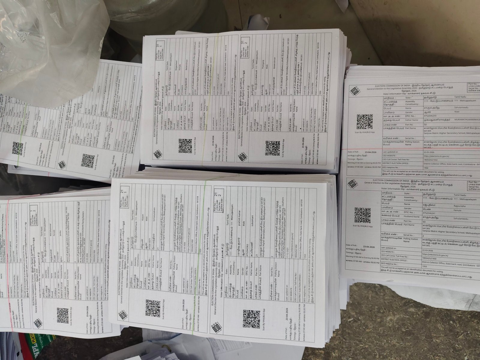 கலெக்டர் அலுவலகத்தில் இதற்காக 10 ஜெராக்ஸ் மெசின் வைத்து அனைத்து தொகுதிக்கும் வாக்காளர் தகவல் சீட்டு அச்சடிப்பு பணி நடத்தி வருகின்றனர். இது மட்டுமின்றி வாக்காளர் வழிகாட்டி மேப்பும் அச்சடிக்கப்பட்டு வருகிறது. 27.44 லட்சம் வாக்காளர் தகவல் சீட்டு 10 சதவீதம் கூடுதல் தாள்களுடன் அச்சடிக்கப்படும்.