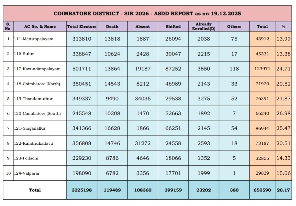 கோவை மாவட்டத்தில் வரைவு வாக்காளர் பட்டியல் வெளியிடப்பட்டது. இதில் 6.50 லட்சம் வாக்காளர்கள் நீக்கம் செய்யப்பட்டனர். இறந்ததாக ஒரு லட்சத்து 19 ஆயிரம் பேர் நீக்கப்பட்டனர். மாவட்ட அளவில் தற்போது 25.74 லட்சம் வாக்காளர்கள் மட்டுமே உள்ளனர். 20.17 சதவீதம் வாக்காளர்கள் பட்டியலில் இருந்து நீக்கப்பட்டிருக்கின்றனர்..