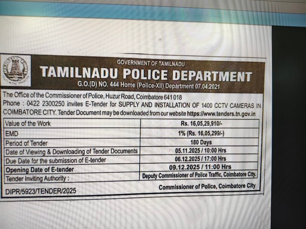 இந்த நிலையில் மாநகரப் போலீசில் 1400 புதிய கேமராக்கள் 16.05 கோடி ரூபாய் செலவில் அமைக்க டெண்டர் விடப்பட்டிருக்கிறது. நவீன வசதிகள் மற்றும் வாகனங்களின் பதிவு எண் கண்டறியும் வகையில் இந்த கேமராக்கள் அமைக்கப்படும். 180 நாட்களில் கேமரா அமைத்து பராமரித்து பயன்பாட்டுக்கு கொண்டு வர டெண்டர் விதிமுறையில் தெரிவிக்கப்பட்டு இருக்கிறது.