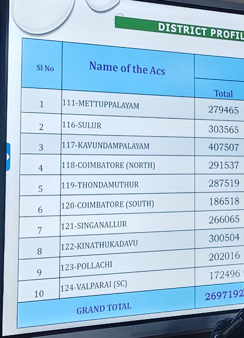 கோவை வடக்கு சட்டமன்ற தொகுதியில் 291537 வாக்காளர்கள், தொண்டாமுத்தூர் சட்டமன்ற தொகுதியில் 287519 வாக்காளர்கள், கோவை தெற்கு சட்டமன்ற தொகுதியில் 186518 வாக்காளர்கள், சிங்காநல்லூர் பகுதியில் 266065 வாக்காளர்கள் கிணத்துக்கடவில் 300504 வாக்காளர்கள் பொள்ளாச்சியில் 202016 வாக்காளர்கள் வால்பாறையில் 172496 வாக்காளர்கள் இருப்பது தெரியவந்தது.