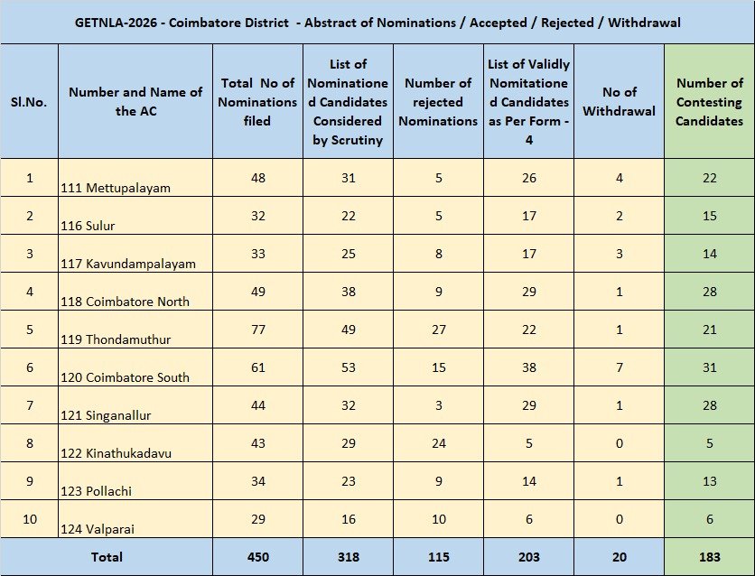 கோவை மாவட்டத்தில் 183 வேட்பாளர்கள் போட்டி, 20 பேர் வாபஸ்…!