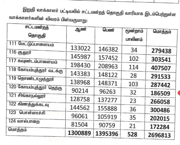 கோவை மாவட்டத்தில் 26. 96 லட்சம் இறுதிப்பட்டியல் வாக்காளர்கள்..