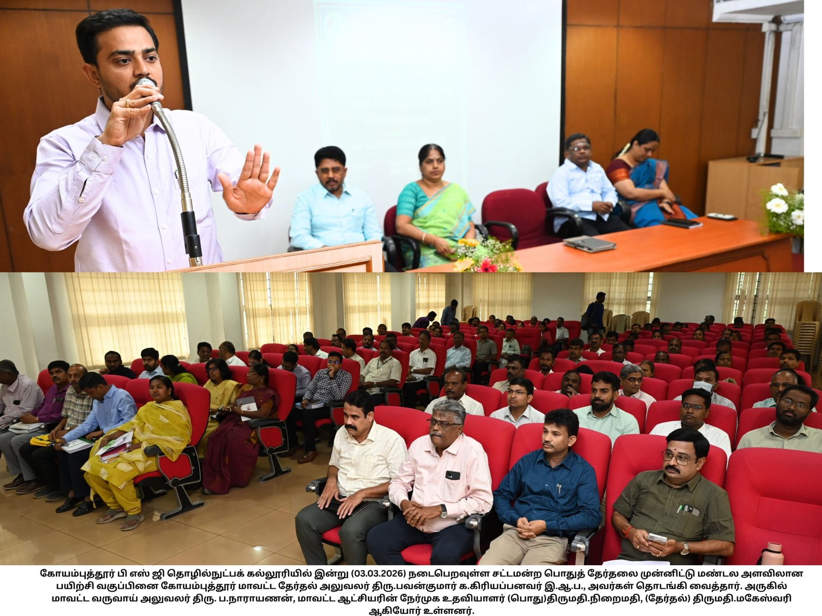 இதில் கோவை மாவட்ட கலெக்டர் பவன்குமார், 30க்கும் மேற்பட்ட சட்டமன்ற தொகுதிகளில் ஆர்ஓ , ஏஆர்ஓ மற்றும் தேர்தல் பணி அலுவலர்களுக்கு மாஸ்டர் டிரைனர் மூலமாக பயிற்சி தரப்பட்டது.