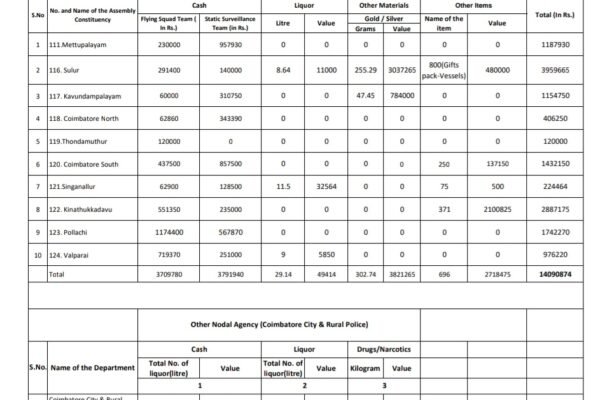 கோவை மாவட்டத்தில் 10 சட்டமன்ற தொகுதிகளில் பல்வேறு தேர்தல் பறக்கும் படை, நிலையான கண்காணிப்பு படையினர் சோதனை செய்து பறிமுதல் செய்து வருகிறார்கள். முதல் நாளான 16ம் தேதி 4 இடங்களில் நடந்த சோதனையில் 30,17,150 ரூபாய் பறிமுதல் செய்யப்பட்டது. 56,244 ரூபாய் மதிப்பிலான 120 மதுபாட்டில்கள் பறிமுதல் செய்யப்பட்டது. கடந்த 17ம் தேதி நடந்த சோதனையில் லட்ச ரூபாய் மதிப்பிலான 10 கிலோ கஞ்சா 7.13 லட்ச ரூபாய் மதிப்பிலான சில்வர் ஆபரணம் போன்ற பரிசு…