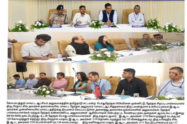 கோவை மாவட்ட கலெக்டர் அலுவலகத்தில் சட்டமன்ற பொது தேர்தல் சிறப்பு பார்வையாளர் பிரதாப் சிங் தலைமையில் அனைத்து அமலாக்க முகமைகளின் அலுவலர்கள், தேர்தல் பார்வையாளர்கள் மற்றும் தேர்தல் கண்காணிப்பு அலுவலர்களுக்கான நடைமுறைகள் குறித்த ஆய்வு கூட்டம் இன்று நடந்தது. இதில் கோவை மாவட்ட கலெக்டர் பவன்குமார், தேர்தல் பார்வையாளர்கள், கணக்கு பார்வையாளர்கள், மாநகர போலீஸ் கமிஷனர் கண்ணன், கோவை மாநகராட்சி கமிஷனர் சிவகுரு பிரபாகரன், கோவை மாவட்ட எஸ்பி கார்த்திகேயன் உள்பட பலர் கலந்து கொண்டனர். இந்த…